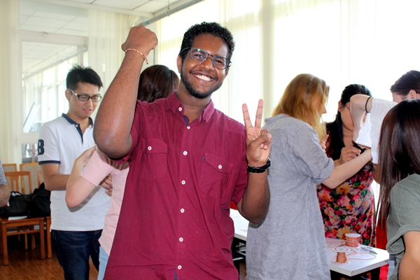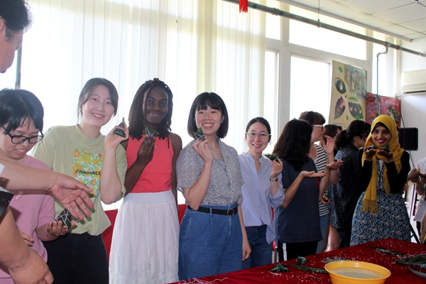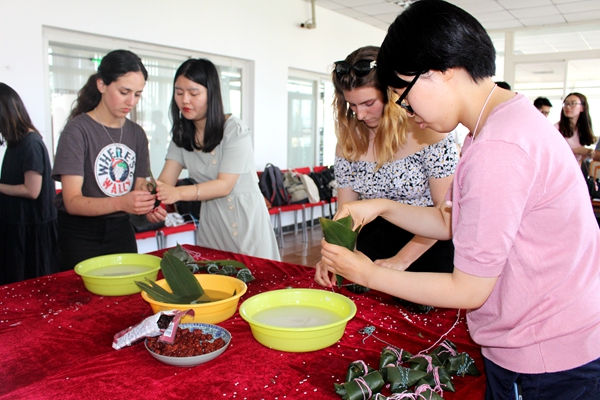 活动现场,留学生们在老师的指导下也纷纷学起了包粽子。“看起来容易,但是做起来挺难的。”来自菲律宾的德思丽坦言,“我很喜欢中国的美食,粽子非常好吃,我会继续努力的,再包三四个粽子,给我的朋友们尝一尝。”