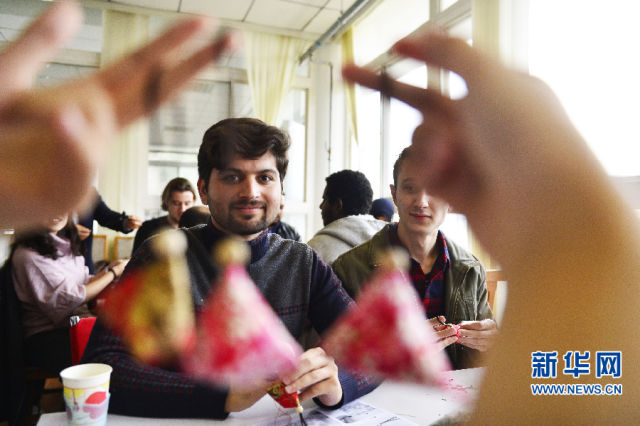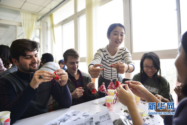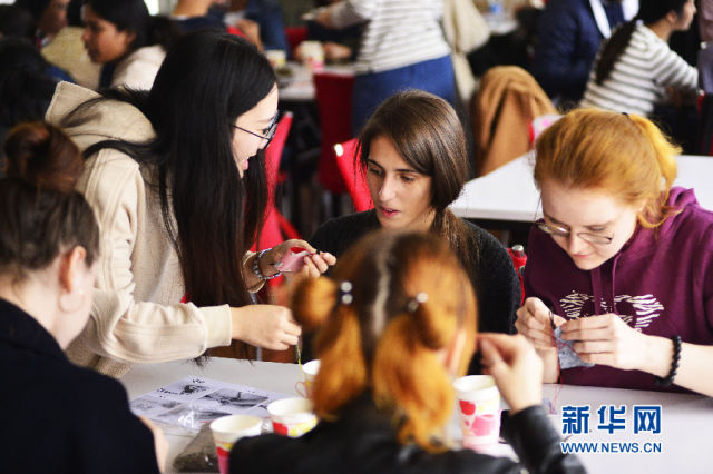 ↑图为留学生齐聚一堂,品菊花茶,做茱萸香包。新华网发(史淞予摄)