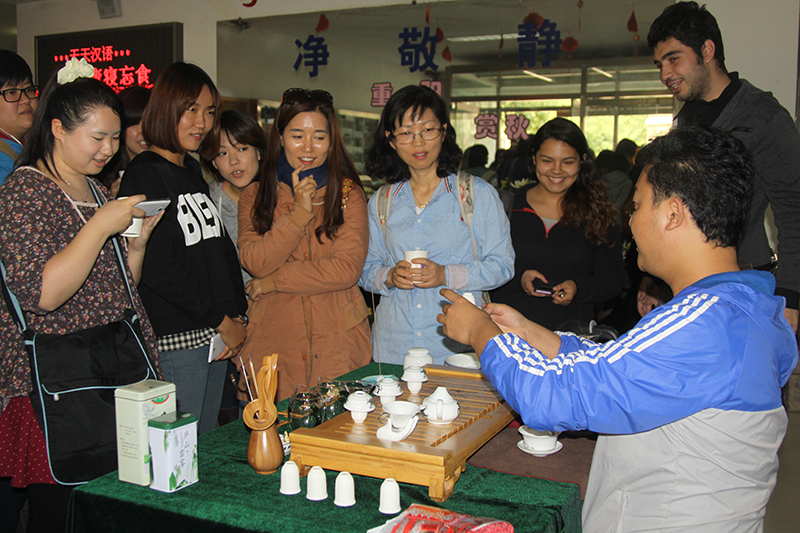 活动当日,学院为留学生精选不同品种的菊花进行展示,并专门安排学生志愿者进行讲解。活动现场另一侧,有老师为同学现场进行专业茶艺表演,并邀请留学生品尝不同类别的菊花茶。
