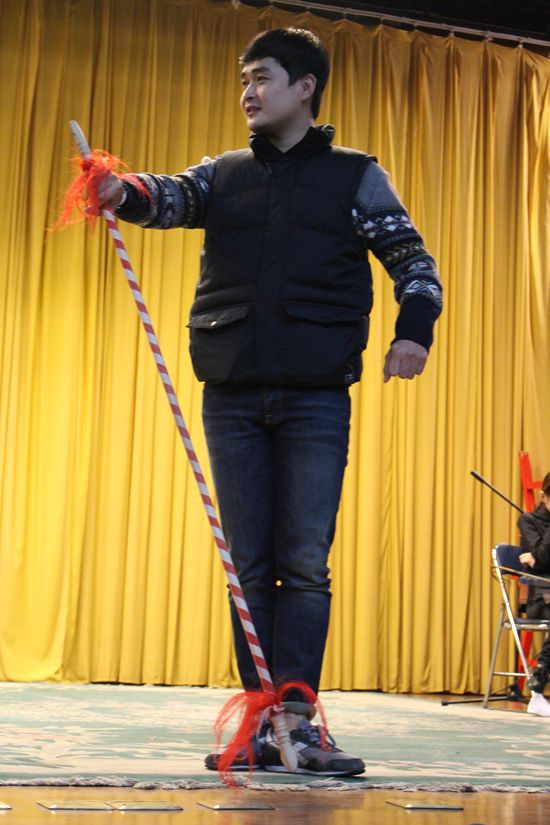 在随后的体验环节,留学生热情四溢,积极参与。不仅和中国学生一起上台学习甩练水袖,操弄花枪,甚至还向对方发起挑战,学念《报灯名》里的台词。虽然不像中国学生的字正腔圆,但清晰的发音,较好的节奏,让他们赢得了现场观众的支持。