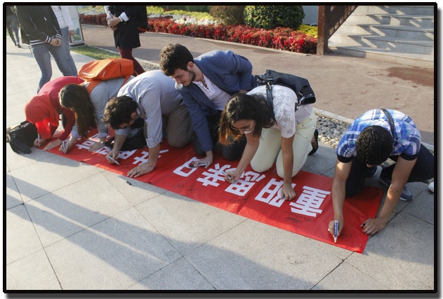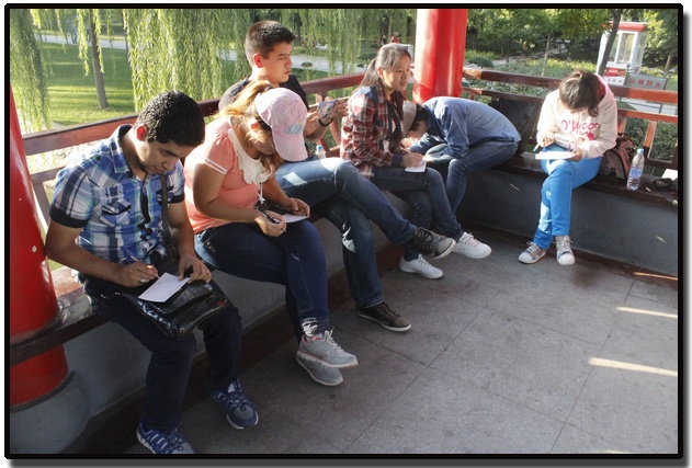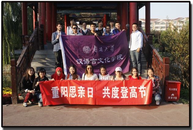 重阳佳节是中国传统节日之一,这天所有亲人都要一起登高远眺,插茱萸、赏菊花,免灾避祸,有期盼生命长久、健康长寿的寓意。听了中国学生对重阳节来源与习俗的讲解后,中外学生组成两队在南翠屏公园拉起了登山比赛。在欢笑声中,学生们“争前恐后”,以极快的速度登到山顶,一览天津美景,并得到了精美的小礼物。同时,留学生们和中国学生还一起书写了承载着思亲情怀的的明信片寄给家乡的亲人们。