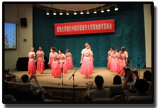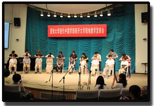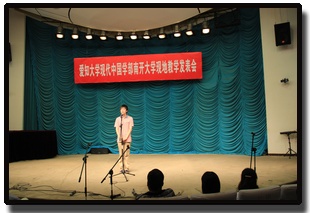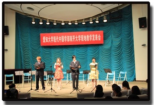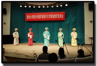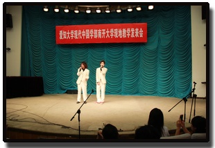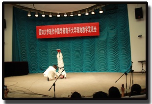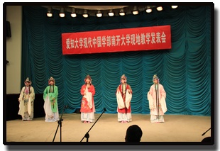 本次发表会的舞台完全属于留学生。四位主持人也是从留学生当中挑选出来的,他们以其流利的汉语引导着活动的进程。在各项才艺表演中,国粹京剧受到热捧,表演者在服饰、化妆、唱腔上都下了一番功夫。学习成果展示的方式也不拘泥于一般形式。在指压表演中,由老师们上台亲身体验学生的指压按摩,引得观众纷纷录像。老师们走下舞台后还互相交流,“还真是舒服”、“可能学生有所顾忌,力道要是再大一点就更好啦。”演讲《我的汉语不太好》则更为直接地表现了留学生们的汉语学习水平,这位留学生不但没带演讲稿,而且演讲内容完全脱口而出。在演讲中这位留学生还提及自己如何学会用汉语讨价还价,台下掌声已然不断,他却还说自己汉语不太好,谦虚不已。相声剧《乐在津门》又将留学生们在南开的学习经历浓缩在舞台上,不太懂日语的中国老师与汉语水平不太高的留学生之间由于语言障碍而引起的闹剧以及相互间的磨合在短短的三幕剧中得以呈现,展现了师生间从“初相逢”到“相见欢”再到“喜相逢”的过程。