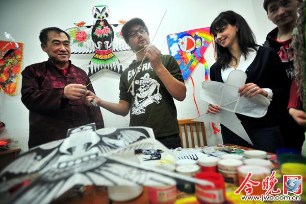 图为留学生们在民间艺人的指导下,制作小风筝。渤海早报记者游思行通讯员马超摄