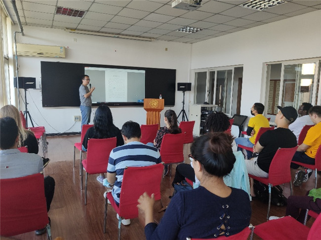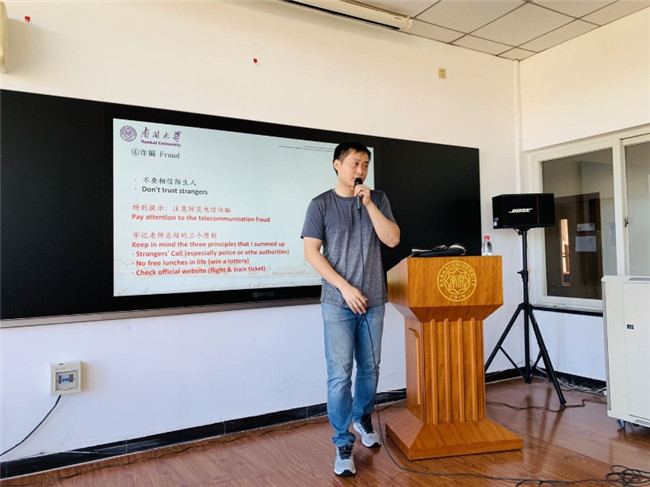 本科生、研究生学则进行了讲解;党委学工部学生心理健康中心老师与国际学生分享了如何克服应对在华在校期间,因文化差异、环境不适、学习压力等产生一定的心理问题,并提供了学校学生心理健康中心等有效求助途径;党委宣传部干部与校史宣讲团成员以轻松愉悦的方式向国际学生讲述了南开的百年校史;国际学术交流处副处长欧迎希以“和新生谈谈心”为主题,从语言、融入、学习和未来四个角度与学生交流,帮助学生尽快适应学校生活。欧迎希还就防疫工作进行动员,希望同学们在防疫常态化工作期间,遵守防疫规定,避免跨城市、地区的外出,尽量避免人多的场所,进出校园提前申请。