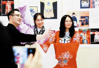 “黄颜色在戏曲舞台上,基本上都是皇家穿的,这一件黄色的你来试试,这件服装叫帔,是皇帝上完早朝,回到后宫穿着的便服……手略微翘一点,放松些,身子往上挺,腰往这儿挪,眼睛看前方……”来自天津市青年京剧团的京剧演员张悦正在给试穿戏服的学生指导“手眼身法步”,边讲还边示范着不同的戏曲动作,让学生穿着戏服以戏曲姿势拍照,近距离感受戏曲艺术的魅力。