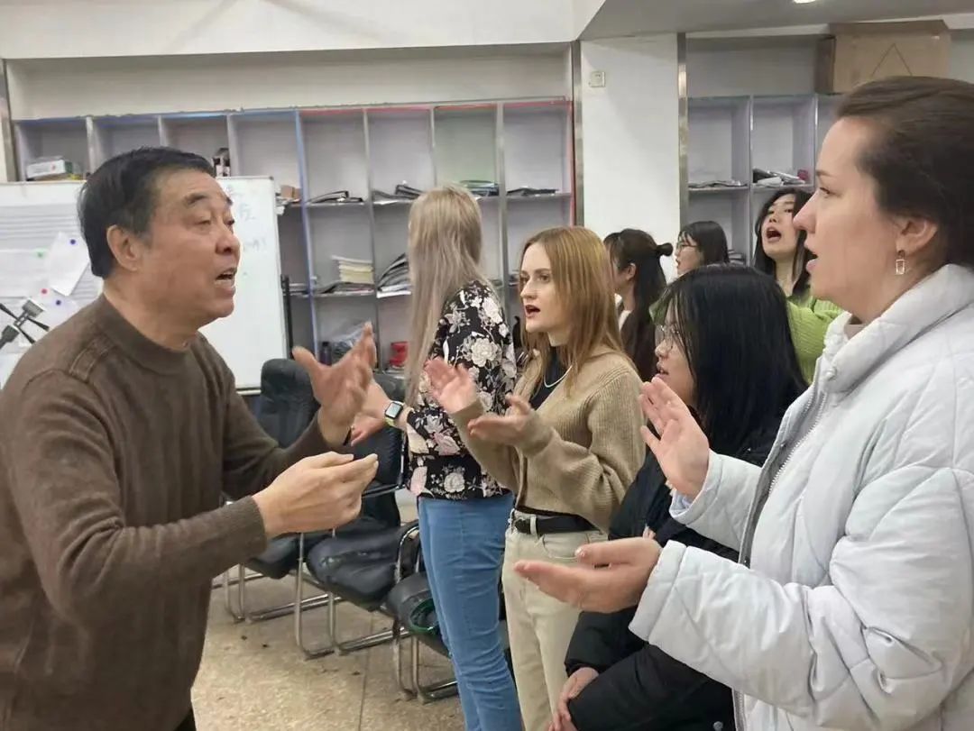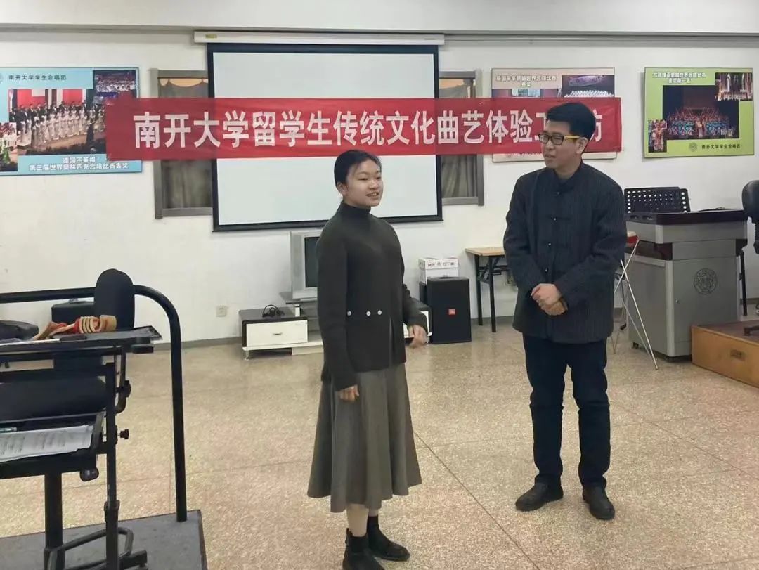 “我是国际留学生,美丽中国万里行,学会京东传鼓韵,歌唱校园四季情...”第一个环节中,京东大鼓国家级非遗代表性传承人倪万珠,受邀为留学生教授京东大鼓的演唱技巧。看着简单的四句唱词,要用京东大鼓的韵味唱出来,对于留学生来讲不容易。倪万珠先是一句一句的教,然后一个字一个字的纠正,再指出关键词的发音特点。老师不厌其烦教的仔细,学生们也全情投入,学的认真。一个多小时的时间,留学生们就能够跟随现场乐队的伴奏,顺利的唱下来。倪万珠说:“这些留学生都是‘生坯子’,第一次接触京东大鼓,短时间内能唱到这个状态,很不容易。京东大鼓的唱词,发音要平平仄仄四声准确,通过学习京东大鼓,对提高留学生的汉语水平很有帮助。我作为非遗传承人,通过这样的教学活动,也是在传播、传承非遗文化。”