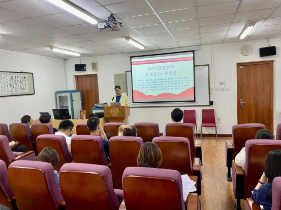 院长刘佳教授宣讲了《新时代高校教师职业行为十项准则》。刘佳表示:作为高校教师,我们始终要坚持党的思想引领,把师德师风建设摆在首要位置。同时,刘佳还带领学习了习近平总书记关于教育的重要论述。刘佳强调:全体教职员工要准确把握教育强国的各项目标任务,全面贯彻党的教育方针,落实立德树人根本任务。