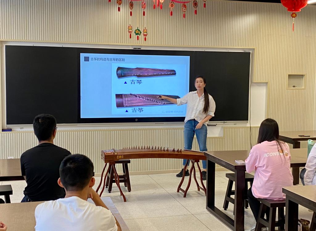 417教室拉开帷幕。本场讲座邀请到天津市音乐家协会古筝专业委员会副秘书长、天津市少年儿童活动中心优秀青年教师高雅琳,以“弹筝论道——古筝知多少”为题,为同学们开展专题讲座和体验活动。