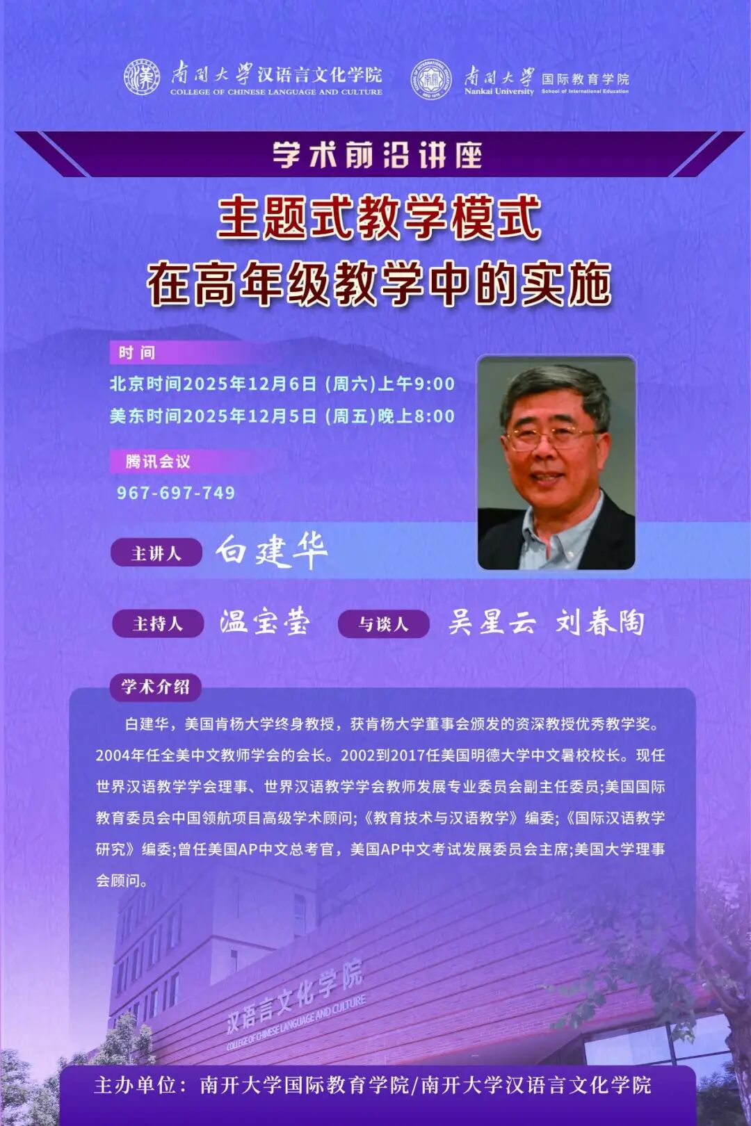主办的学术前沿讲座顺利举行。本次讲座以“主题式教学模式在高年级教学中的实施”为主题,美国明德大学中文暑校前校长、肯扬大学终身教授白建华担任主讲人。5g影院