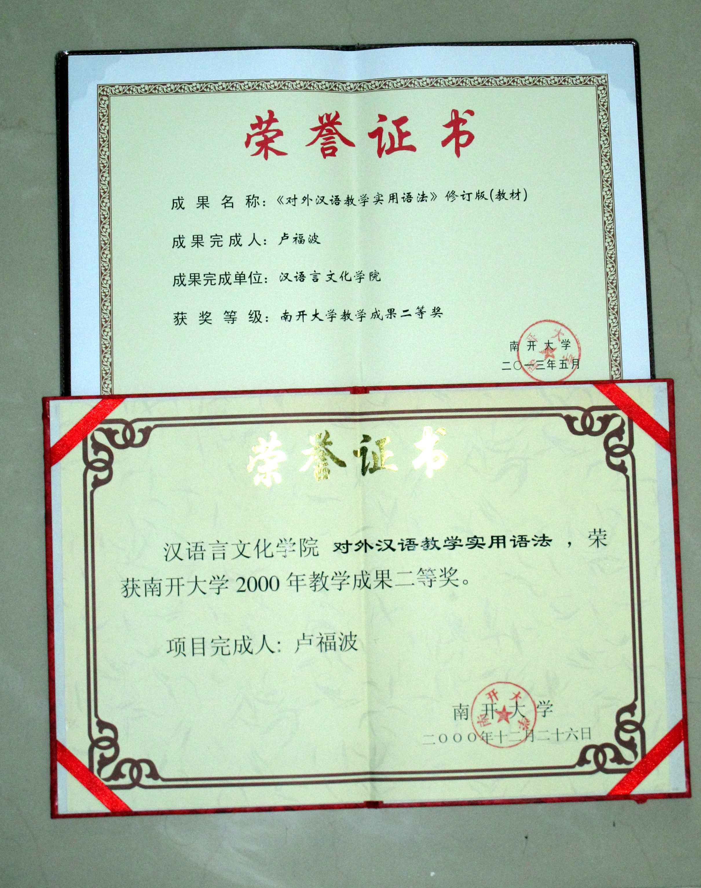 ⑷2000年《对外汉语教学实用语法》获天津市首届语言学学会优秀教材二等奖。